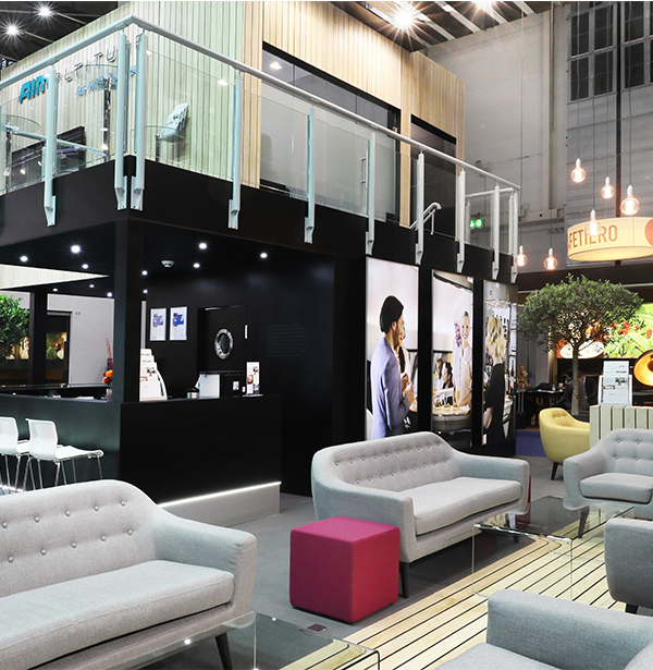 The multi- levelled delegate experience was orientated around individual needs. The product displays led to an open galley bar and lounge area in the heart of the stand, the perfect welcoming space for entertaining and networking.  The use of the double deck allowed us to fulfil the requirement for private and confidential meetings with clients. By creating an upper floor level, we allowed a space for more personal presentations and conversations in private meeting rooms away from the busy show floor.