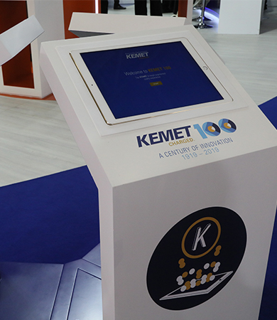+ A screen takeover, triggered by the click of the button was utilised as an impactful stand attraction during the event. Capturing the attention of on-stand delegates on passers-by the Kemet Electronics logo appeared across all on-stand devices simultaneously complemented with music, lighting, and video content.