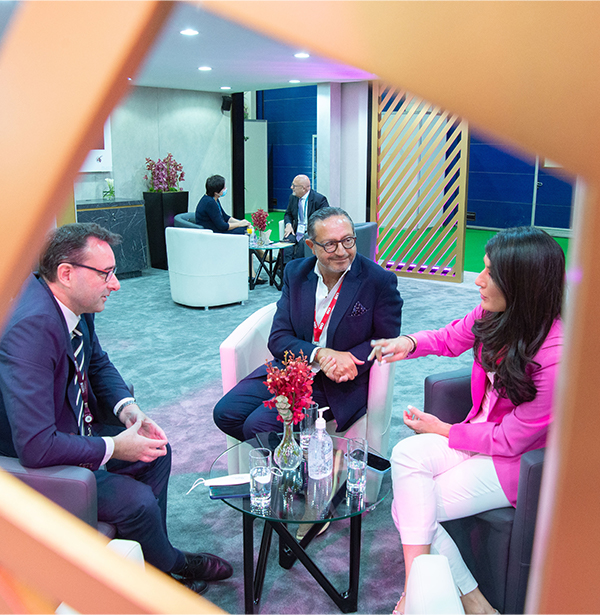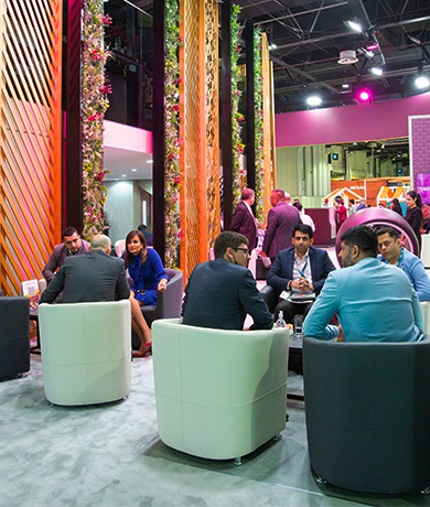 From the 264-tile high-impact LED crown that stood out across the hall, to the exquisite materials and design cues echoing a luxury lounge experience, we showcased QA’s trademark luxurious and memorable travel experience. Key to the concept was providing an airy space, in line with the show’s covid health and safety guidelines that require at least 80% of the total area to be open. High living walls with fine Arabic-inspired fretwork created a sense of space and grandeur in the main ground floor area, providing the ideal platform for digital engagement and business networking. For the upper deck VIP area as well as the CEO lounge, the emphasis was on beautiful natural finishes to create a gourmet dining experience within a welcoming, relaxing environment.