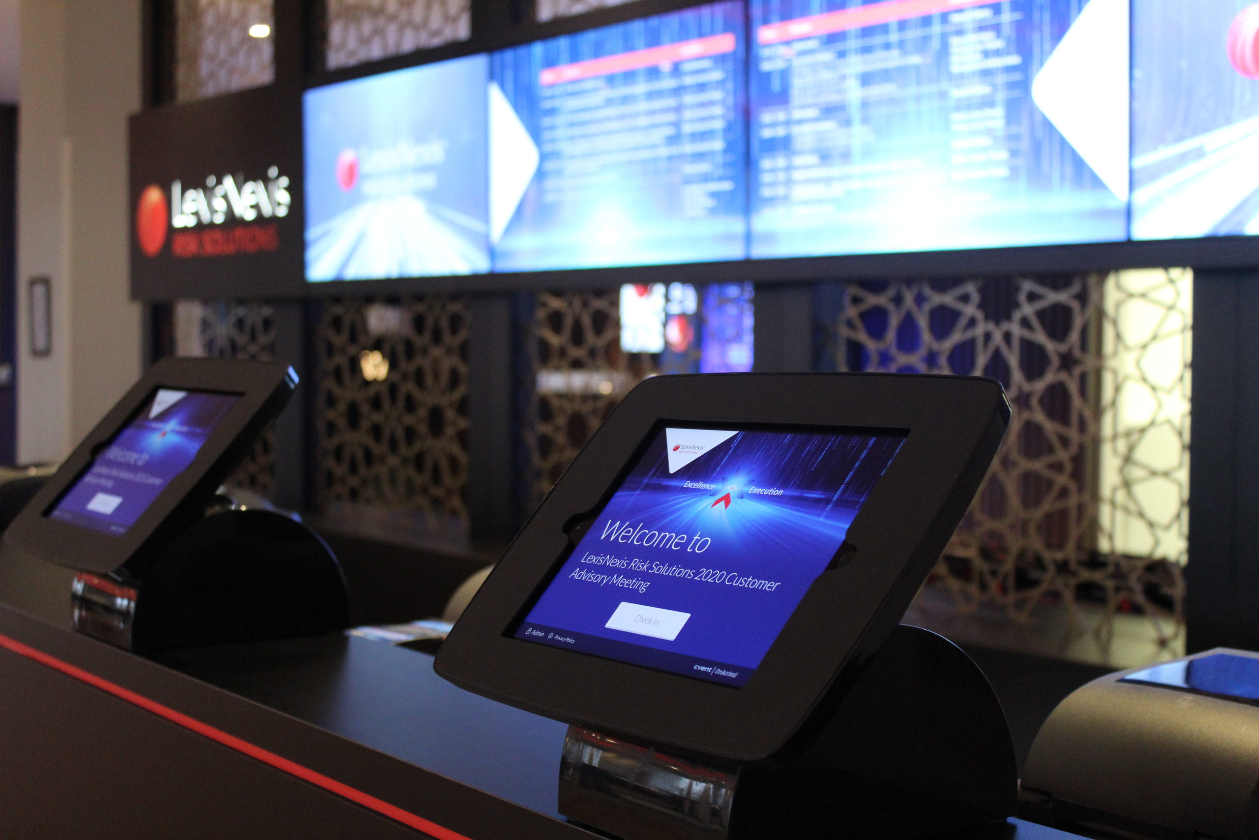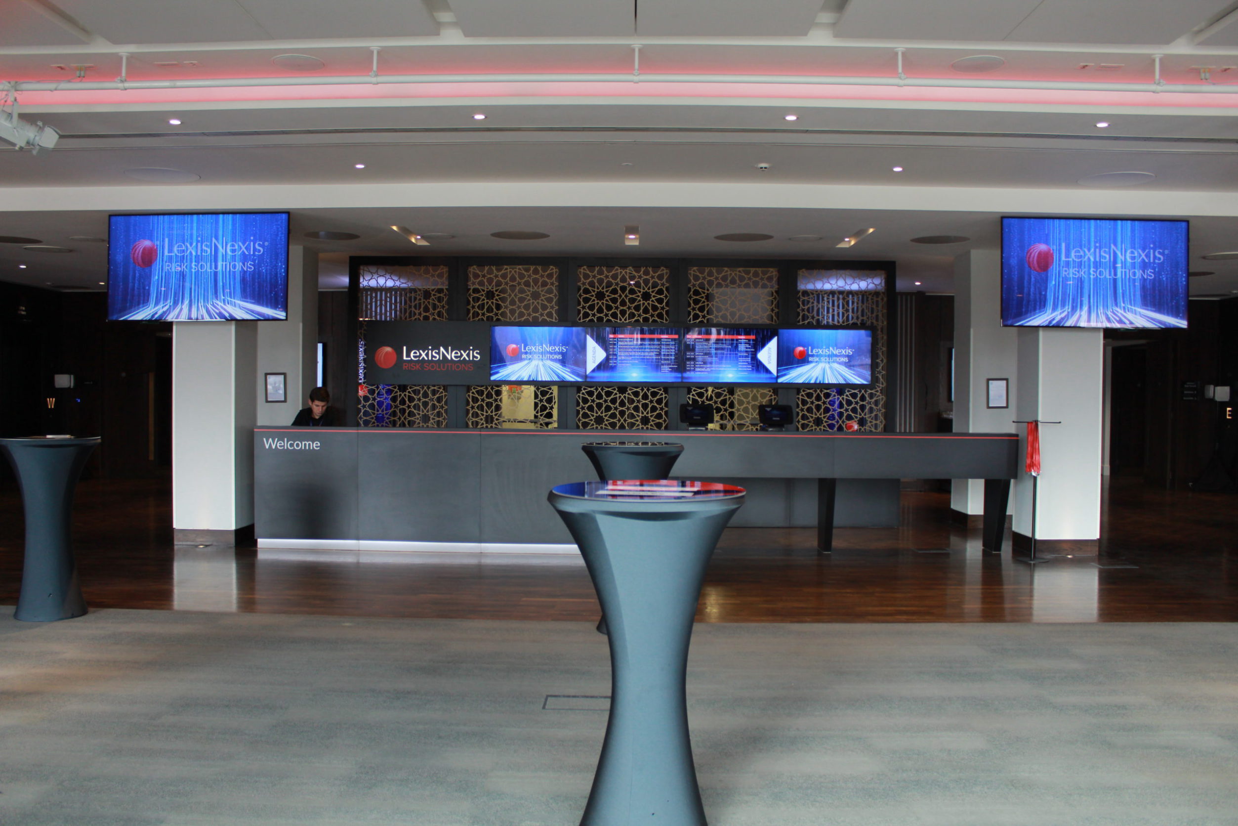 In the beautiful backdrop of the Institute of Engineering and Technology at Savoy Place, London, we designed an open and welcoming space to allow Lexis Nexis to register and entertain clients with food and drink in between lectures. In the Riverside Room on the top floor, overlooking the River Thames, we integrated a branded open reception desk tied in with flat-screen LED’s on a divider wall. With connected iPad and computer printing system, installed with Lexis Nexis’ digital content where data was recorded for later sales use.