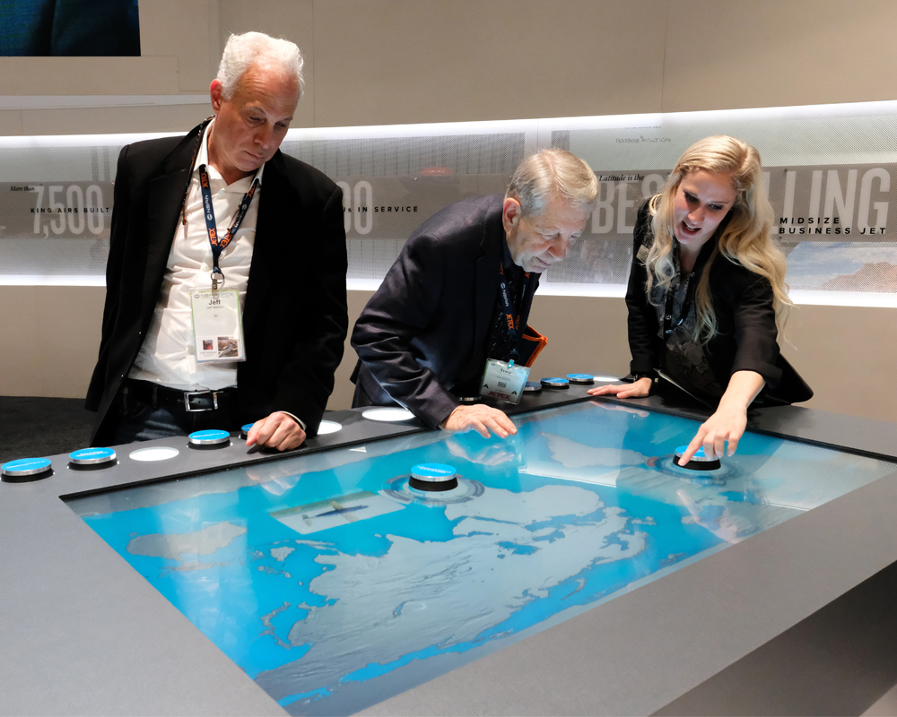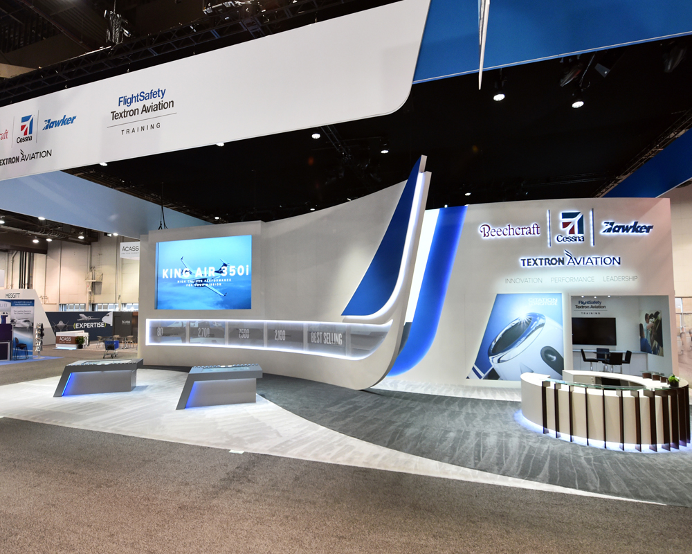 Following our 25+ years’ experience NBAA working alongside major players in the aviation and aerospace industry, Textron Aviation, the umbrella company for Beechcraft, Cessna and Hawker, wanted to make an impact with their fresh and bright exhibition stand. Looking for a way to draw in delegates whilst creating a space to entertain guests lead us to a curved design interjected with harsh lines throughout to add a crisp and engaging design with a hidden bar area. Incorporating the infamous object recognition containing Textron’s data and product information and with added back end ROI tracking all its sales data from the event for reference at future shows on the open side of the stand to welcome delegates.